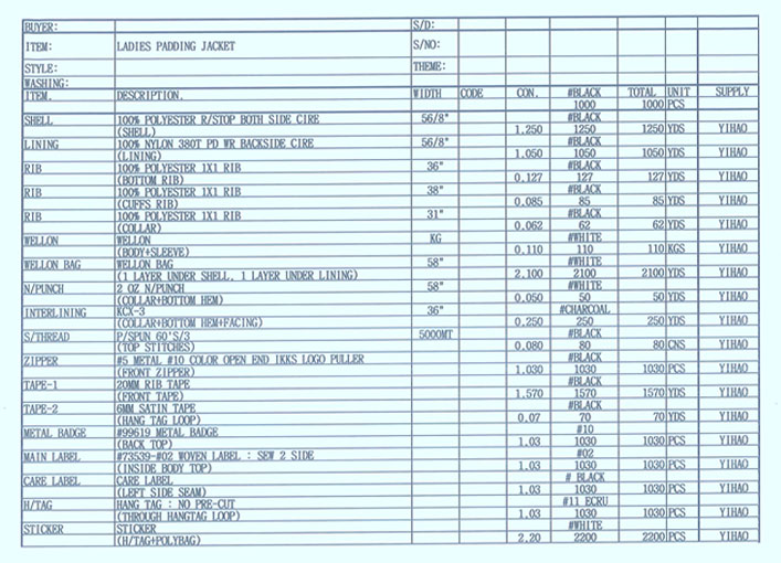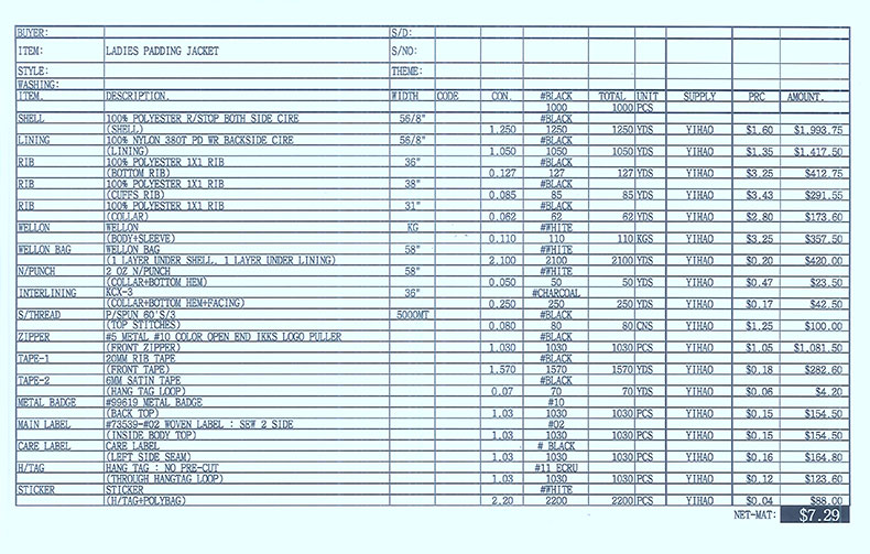 We can supply total cost calculating service on one garment except for CMP. With this service, customers can know total cost of materials for one garment.